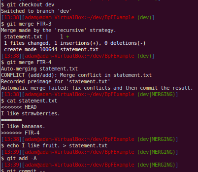 Notice that the conflict has been marked and we resolve it by just rewriting the file to make both branches agree.