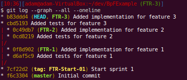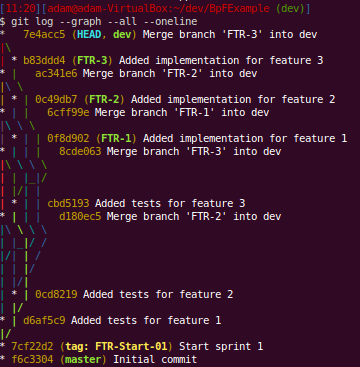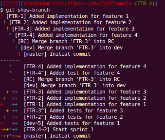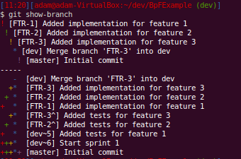 You can follow the lines here but it’s not easy as you don’t get “swim lanes” for your branches. You can see each time that we merged a feature into dev by finding the “Merge branch ‘FTR-X’ into dev”. We can use git show-branch to see what commits exist in what branches: