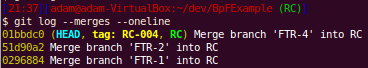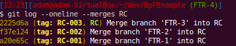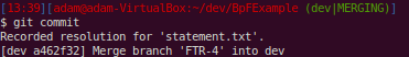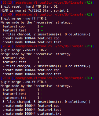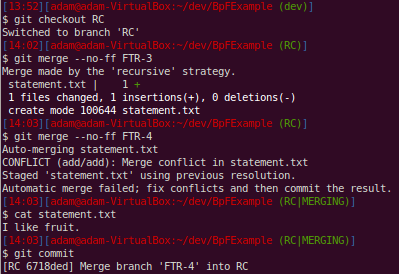 Here, since we had rerere enabled, git records how we resolved this particular conflict. This will help us when we get to the release candidate branch and other people’s work later on.